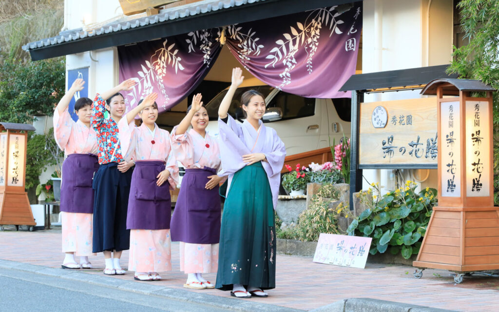 秀花園湯の花膳にようこそ。入口の藤棚と生花が皆様をお出迎えいたします。