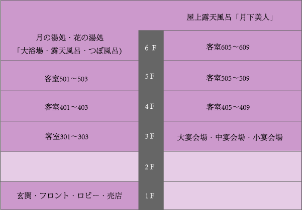 | 屋上湯処 | 屋上露天風呂「月下美人」、展望内風呂「花満月」、展望内風呂「花月夜」、カメ風呂「月の輪」、展望露天風呂「月見草」、つぼ風呂「月の里」 |