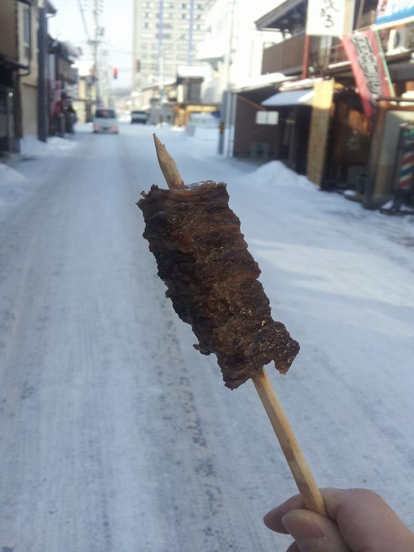 翌日、お土産に飛騨牛を買った「山武商店」と言うお店で「お兄ちゃん、これ持って行きな」と渡された飛騨牛の串焼き