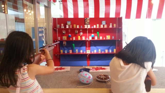輪投げ、射的、ヨーヨ釣り、くじ引き(ガラガラのやつ)、お面、輪投げ等、を行っております。