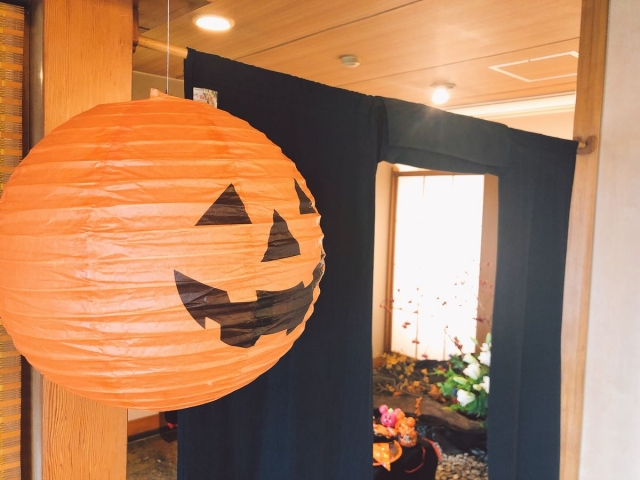 当館では、現在フロント周りをハロウィンにしております。