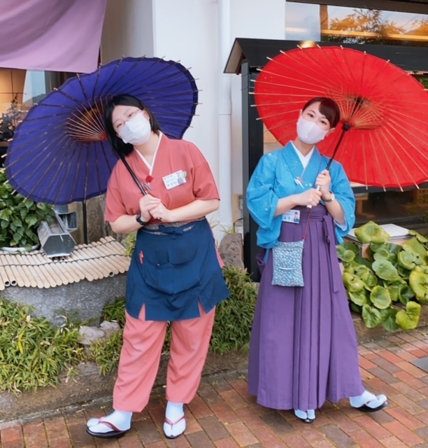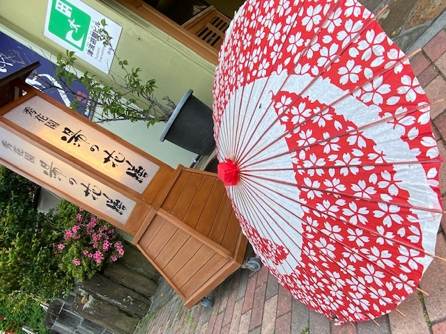 また、お申し付けいただければ、お客様も当館の看板前で番傘を持ってお写真もお撮りいただけちゃいます!!お気軽にお申し付けくださーーーい!!