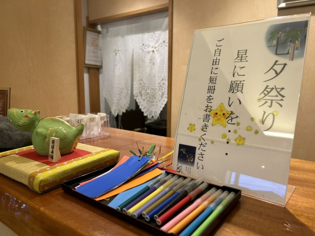 短冊はフロントロビーと湯上り処のテーブルにございますので、ぜひ!!皆様も願い事を書いて笹に飾っちゃいましょう☆彡